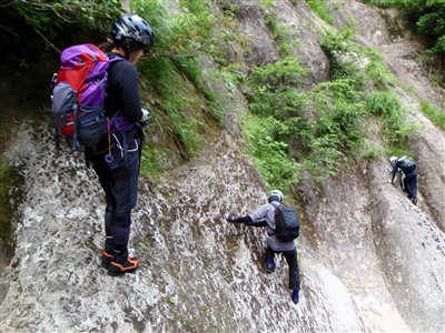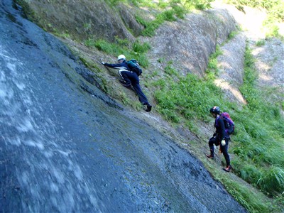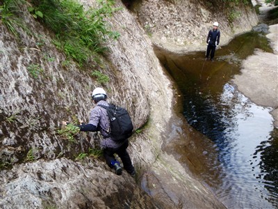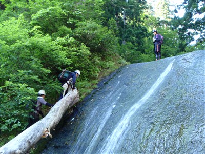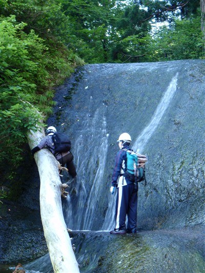 滝の左側から,倒木を利用して松浦君が挑戦。