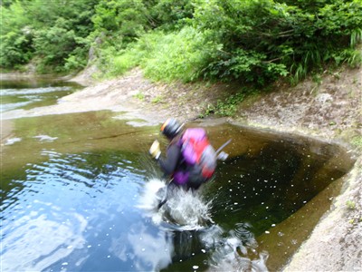 抜かれてなるものかと,滑って滝壺に飛び込んだ常田君。
