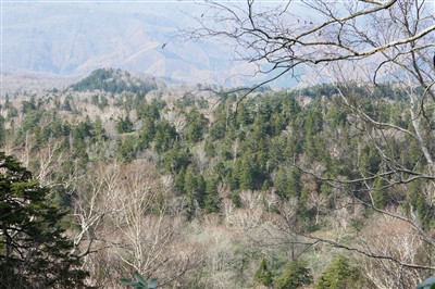 蒸の湯温泉の東側にある大きな滑落崖に,コメツガの多い植生が見られます。