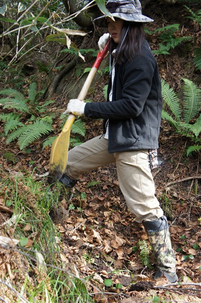 この崖錐には薄い土しかないのか確認するために,場所を変えてスコップを刺してみます。