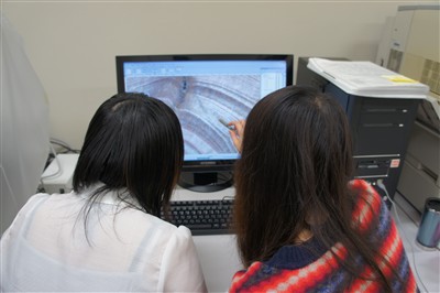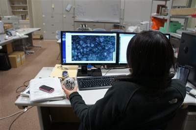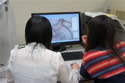 研磨してスキャナーで読み込んだ年輪の数を数えます。