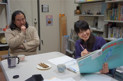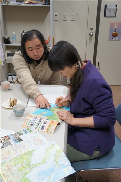 2012年2月 研究室でベトナム旅行の相談 吉木,佐野先生,今野(4年)