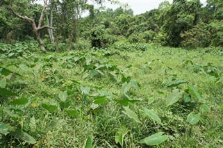 小川沿いの湿地には里芋(タロイモ)が生えています。